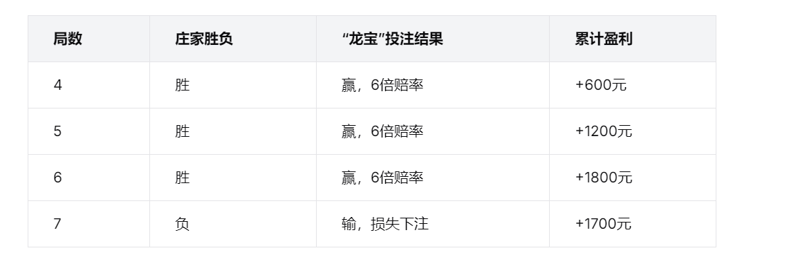 假设某场百家乐游戏,庄家连胜6局,赔率为6倍。如果玩家在第4局开始下注“龙宝”,每局下注100元: